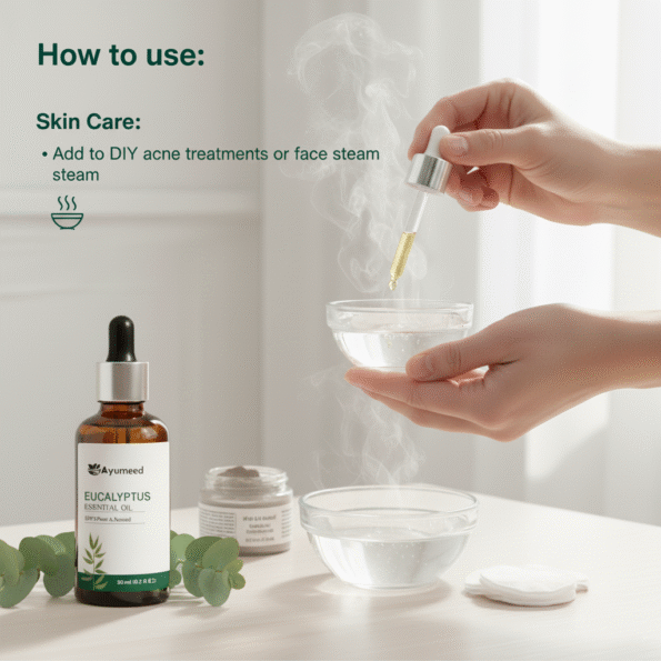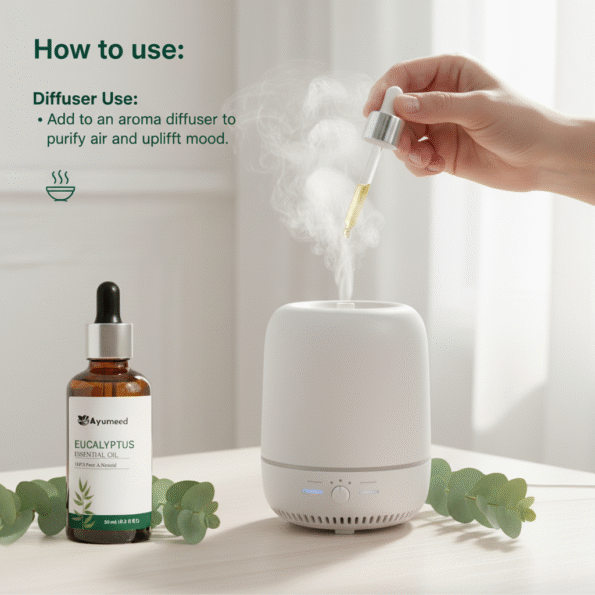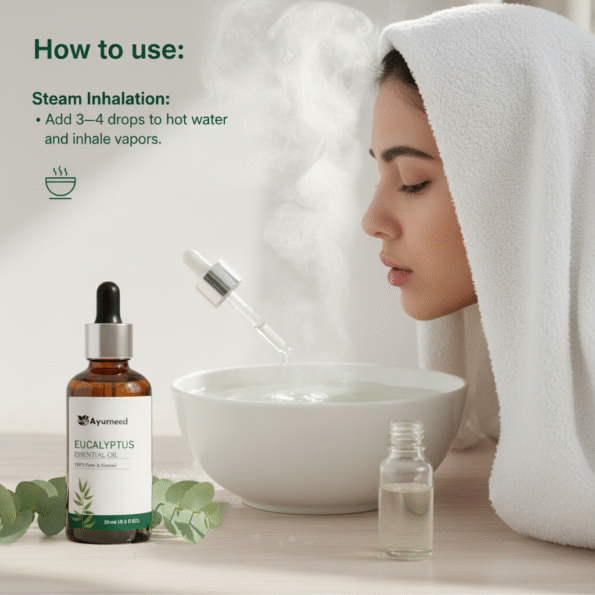 - Steam Inhalation: Add 3–4 drops to hot water and inhale vapors.