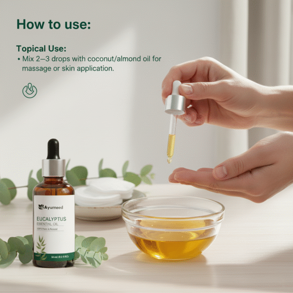 - Topical Use: Mix 2–3 drops with coconut/almond oil for massage or skin application.