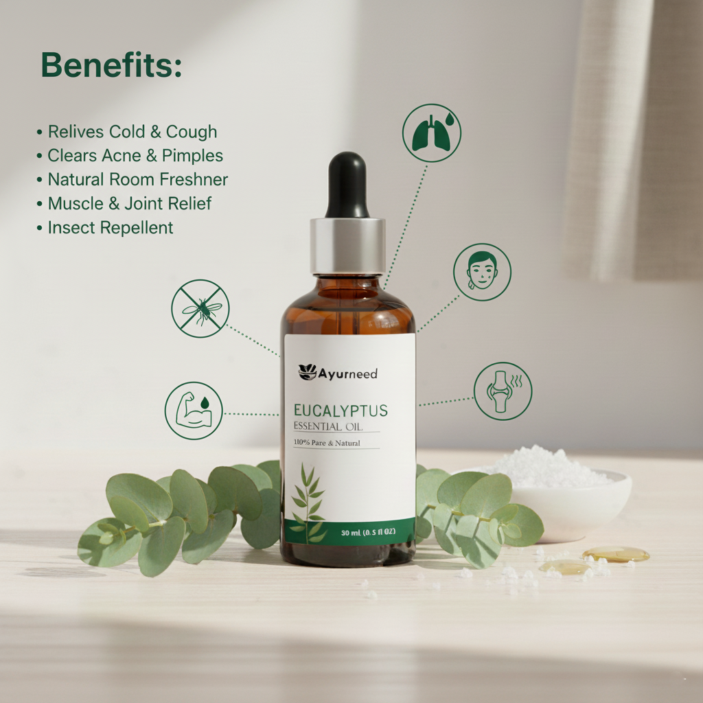 Breathe easy and stay refreshed with Ayurneed™ Eucalyptus Essential Oil – 100% pure, natural, and steam-distilled. Widely known for its powerful decongestant, anti-inflammatory, and purifying properties, this versatile oil is ideal for respiratory relief, skincare, and mental clarity.