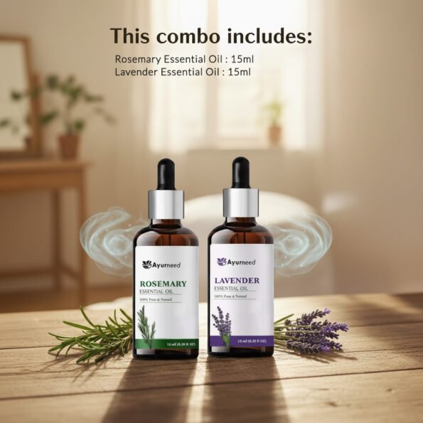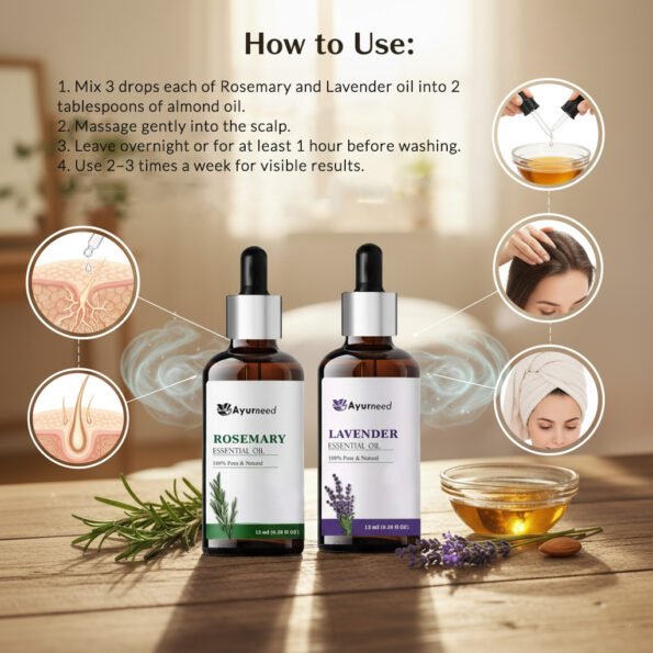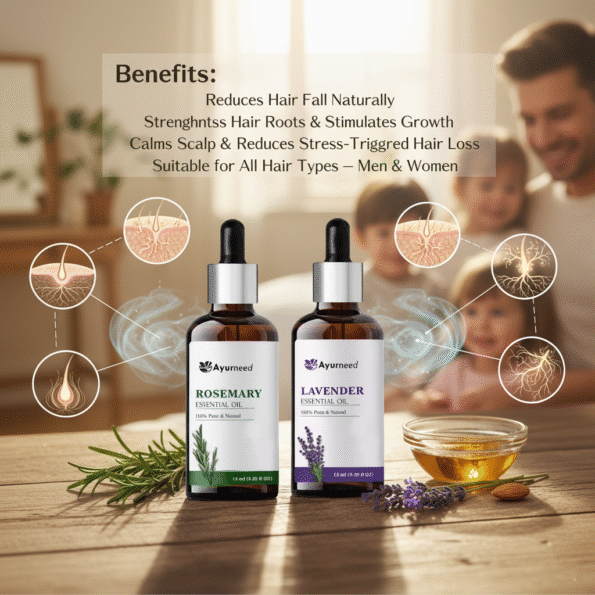 Stop hair fall at the root with Ayurneed™’s powerful hair care combo of Rosemary and Lavender essential oils – a proven natural remedy to reduce hair fall and support healthy hair growth. Simply mix with your regular almond oil for a soothing scalp massage that stimulates follicles, improves blood circulation, and calms stress-related hair loss.