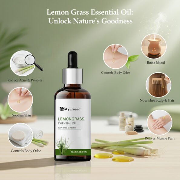 Ayurneed™ Lemongrass Essential Oil for Pain Relief, Skin, Hair & Diffuser Use – 100% Pure & Natural Steam Distilled Oil – 15ml / 30ml | Combo Pack (2-Pack, 3-Pack)