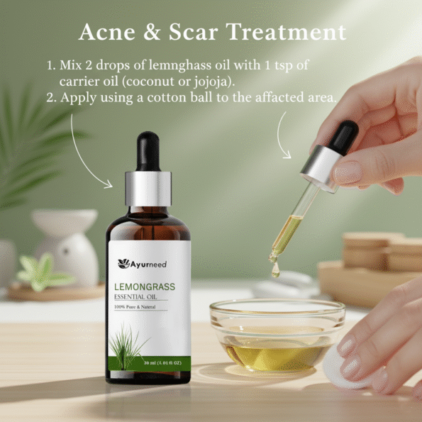 For Acne and Scar Treatment: Mix 2 drops of lemongrass oil with 1 tsp of carrier oil (like coconut or jojoba oil). Apply using a cotton ball to the affected area.