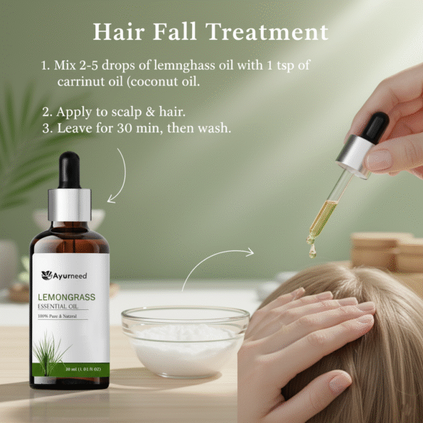 For Hair Fall Treatment: Mix 2-5 drops of lemongrass oil with coconut oil and apply to scalp and hair. Leave it on for 30 minutes before washing.