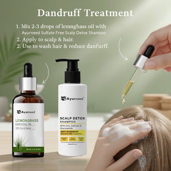 For Dandruff Treatment: Add 2-3 drops of lemongrass oil to your regular shampoo. Use it to wash your hair and reduce dandruff.