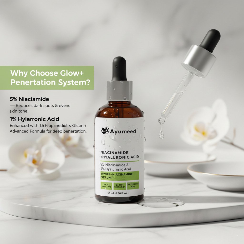 Say hello to clearer, brighter skin with Ayurneed’s Niacinamide + Hyaluronic Acid Serum!