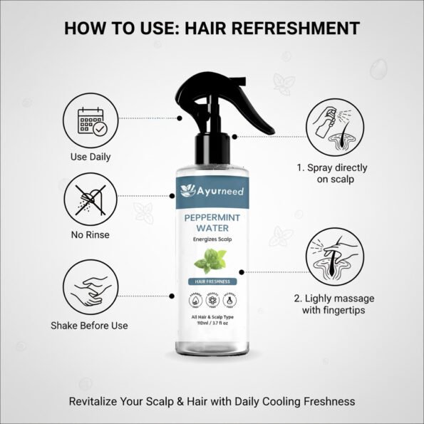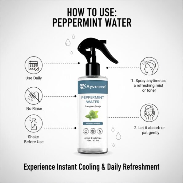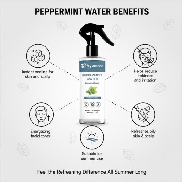 Feel cool, fresh, and energized with Ayurneed™ Peppermint Water Spray – a 100% natural, steam-distilled face and body mist. Made from fresh peppermint leaves, this refreshing hydrosol delivers instant cooling, controls excess oil, and uplifts your mood — perfect for summer, post-workouts, or oily/acne-prone skin.