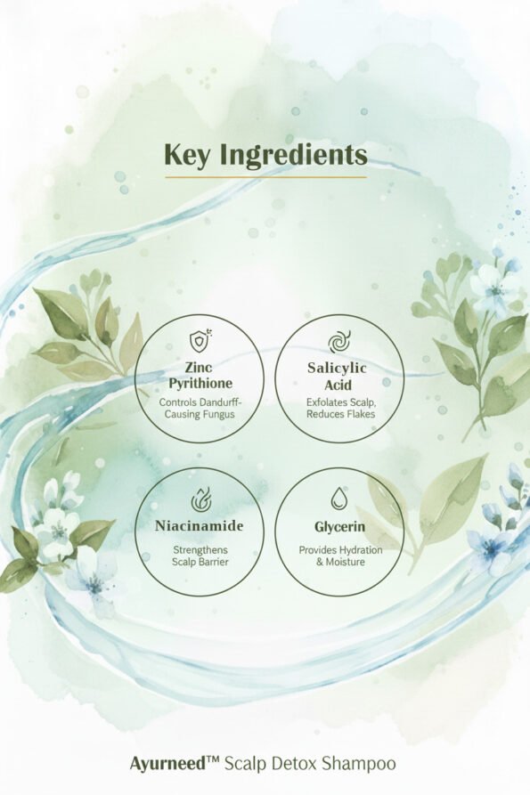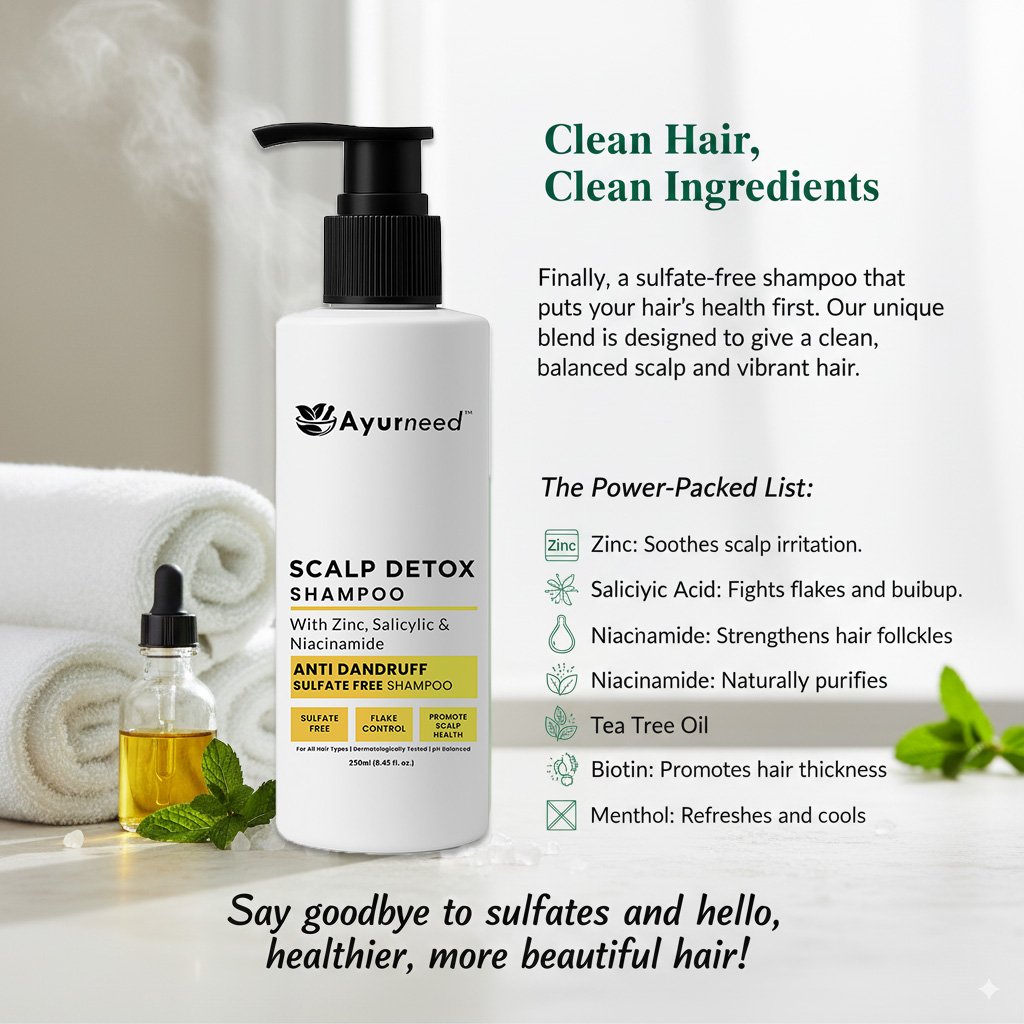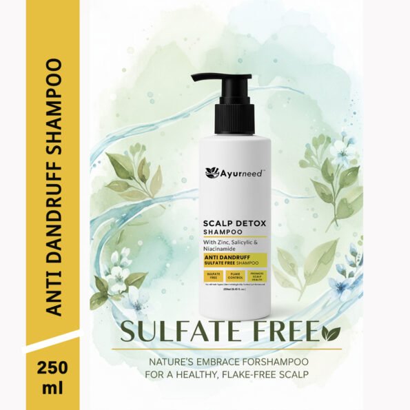 Say goodbye to flakes, itchiness, and buildup with Ayurneed’s Scalp Detox Anti-Dandruff Shampoo.