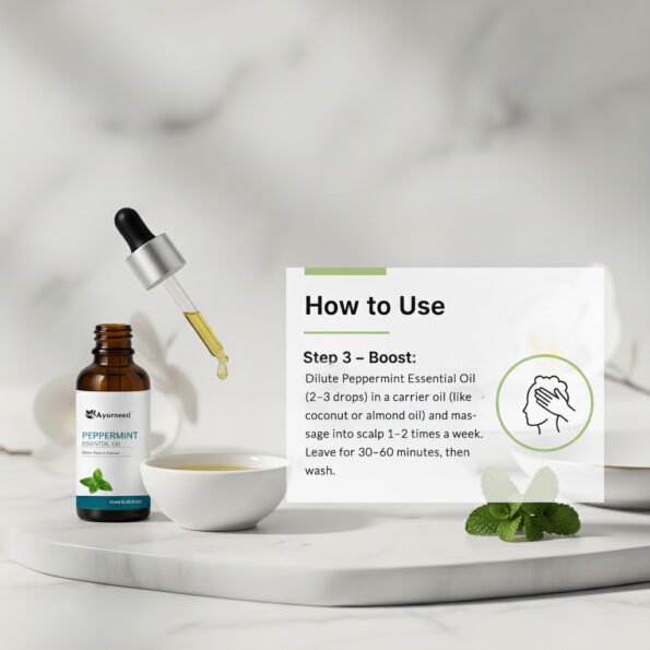 Dilute Peppermint Essential Oil (2-3 drops) in a carrier oil (like coconut or almond oil) and massage into scalp 1–2 times a week. Leave for 30–60 minutes, then wash.