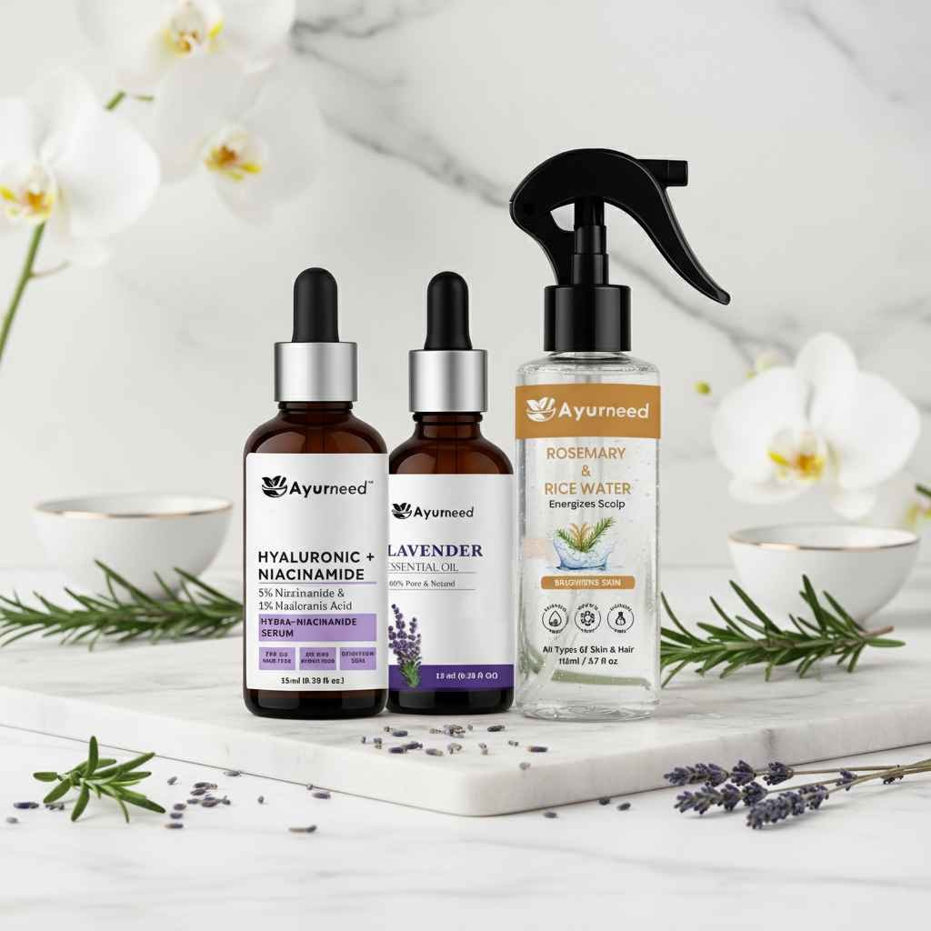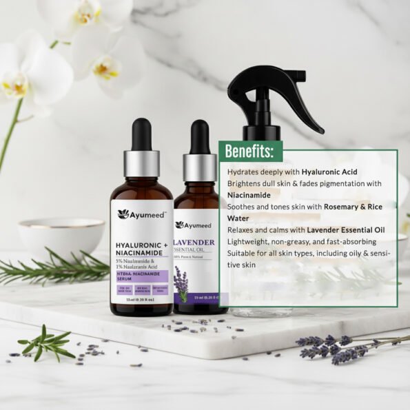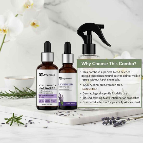Skin Hydration & Brightening Combo – Niacinamide Serum (15ml) + Rosemary & Rice Water Spray (110ml) + Lavender Essential Oil (15ml) | Glow Boosting Skincare Set
