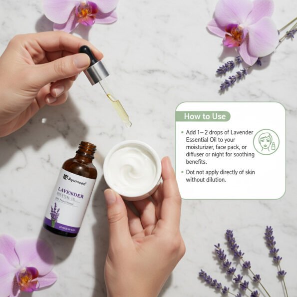 Add 1–2 drops of Lavender Essential Oil to your moisturizer, face pack, or diffuser at night for soothing benefits. Do not apply directly to skin without dilution.